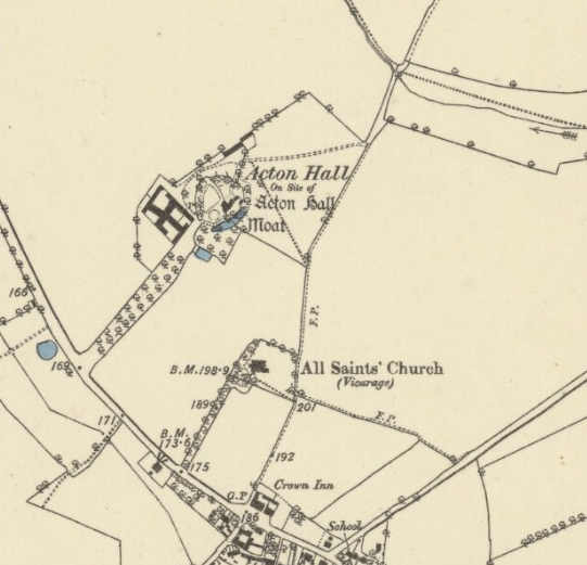 North of Acton village, the isolated moated site of Acton Hall is surrounded by fields with the Church of All Saints (Grade I) c. 250m to the south. Sudbury is c. 4.8km (3mls) to the south-west and the surrounding landscape is of gently rolling arable fields on the Suffolk clayland plateau.