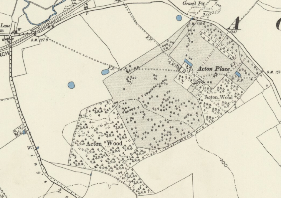The house and gardens were demolished in 1961 to be replaced by an industrial estate, now a business park. By 2022 the majority of Acton Wood had gone, leaving a tiny wood isolated to the south-west of the site and surrounded by agricultural fields. The access road into the business park follows the route of the original entrance drive with a damp depression and dense tree planting to the right as you enter, but straddling the eighteenth century canal that survives, surprisingly intact to the left, as a testament to the former grandeur of Acton Place.