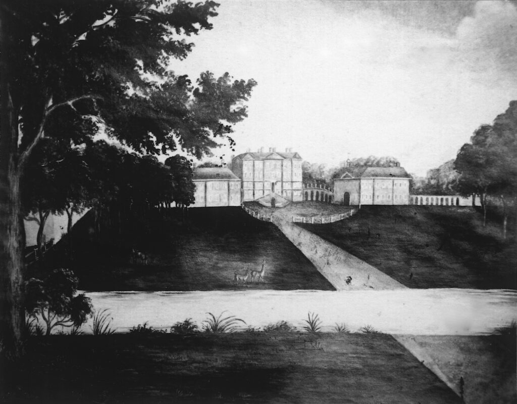 Robert Jennens, Esq., thought to be the son of an extremely wealthy Birmingham ironmaster, acquired the Acton Place estate in 1708 from the Daniel family, who had owned manors in Acton since the early-sixteenth century. Before Robert’s death in 1725 work began to build a great house, designed by the influential British architect James Gibbs, surrounded by a landscape park. Succeeding his father, William Jennens is recorded as an extremely wealthy man and, being a godson of King William III, would have had connections in the highest society. By the time of his death in 1798 the mansion was still not fully completed. An eighteenth century painting shows the house, flanked by two linked pavilions, with a grand flight of steps leading from an enclosed entrance courtyard. In front of the mansion there are deer grazing in the park that flanks the entrance drive. Trees surround the mansion on the other three sides. In the foreground, a canal is shown parallel to the house front, which is shown on both Hodskinson’s 1783 map and the tithe map of 1839 as lozenge-shaped and centrally crossed by the entrance drive. It seems likely it had been created when building work began on the mansion in the 1720s.