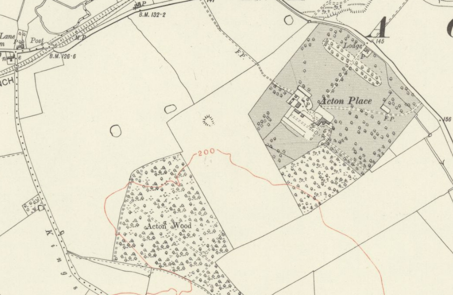 By the 1890s, when the house was tenanted, the surviving wing had been renovated and extended and a partly-walled kitchen garden was added within newly-created pleasure grounds. The parkland was extended by taking in some of the agricultural field to the south of the house and Acton Wood was extended in a strip to create a shelterbelt of trees along the park’s southern boundary that expanded into an additional area of woodland beside the gardens to the rear of the house. Giving privacy to the house from the road, a mixed planting of deciduous and coniferous trees had developed within the canal basin. Writing in 1907, H. R. Barker described Acton Place as ‘a fine mansion in an extensive park with many noble trees’ that are shown on the 1899 OS map dotted mainly in its southern section. The 1928 OS map shows the addition of an entrance lodge and a short avenue of trees flanking the drive, although the majority of the park had once more reverted to cultivated fields. The estate was requisitioned by the military in World War II and used as an army base and later a US military hospital.
