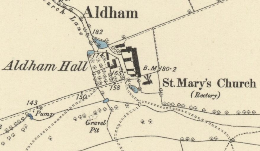 Surveyed in 1839, the tithe map suggests Aldham Hall was once surrounded by a rectangular moat, remnants of which may survive as a pond to the north of the house. The garden area around the house was used for orchards during the nineteenth and into the early-twentieth century, although today these have been replaced with lawns and specimen trees.