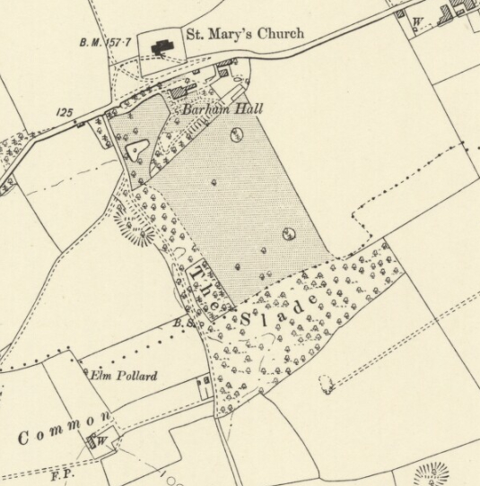 Little changed over the next forty years, although the 1884 Ordnance Survey map gives more detail of the pleasure gardens. The house is shown standing on a platform with a level garden terrace to the south and west. From here a path ran south-westward beside the road boundary to a gateway and another path led to the terraced steep-sided escarpment on the opposite side of the valley. Serving as an entrance lodge, one of the buildings around the coach house/stables stood beside the entrance drive that passed the kitchen garden and curved towards the house. By this time the ponds had developed into one single L-shaped pond. A field south of the escarpment had become part of the parkland by 1905. Fifteen years later sales particulars described the Barham Hall Estate as a mansion with stabling, glasshouses, grounds and 32ha (80a) of land in Barham and Claydon.