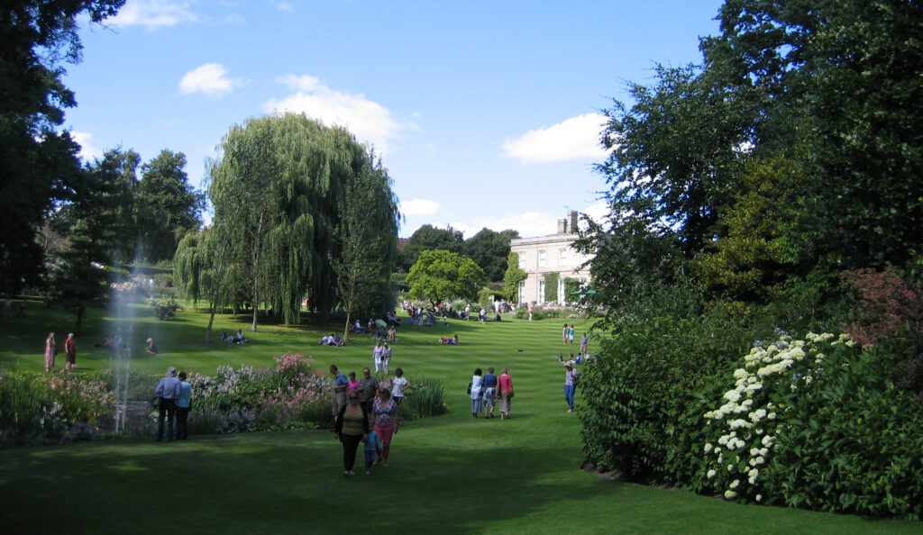 Looking towards the house from the bottom of The Slade where the L-shaped pond, fountain and flower beds mark the collection point for spring water at the lowest level of the valley. (© 2017 Tina Ranft)