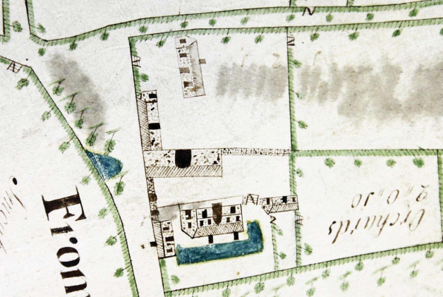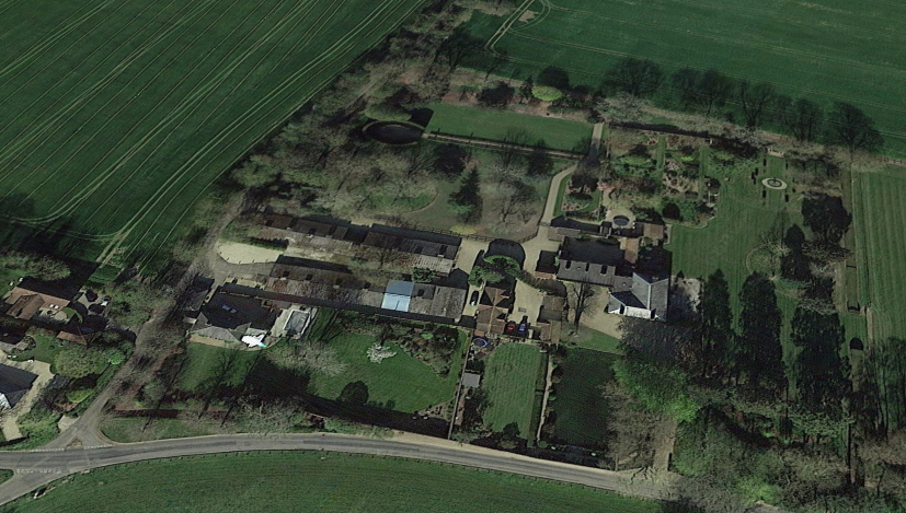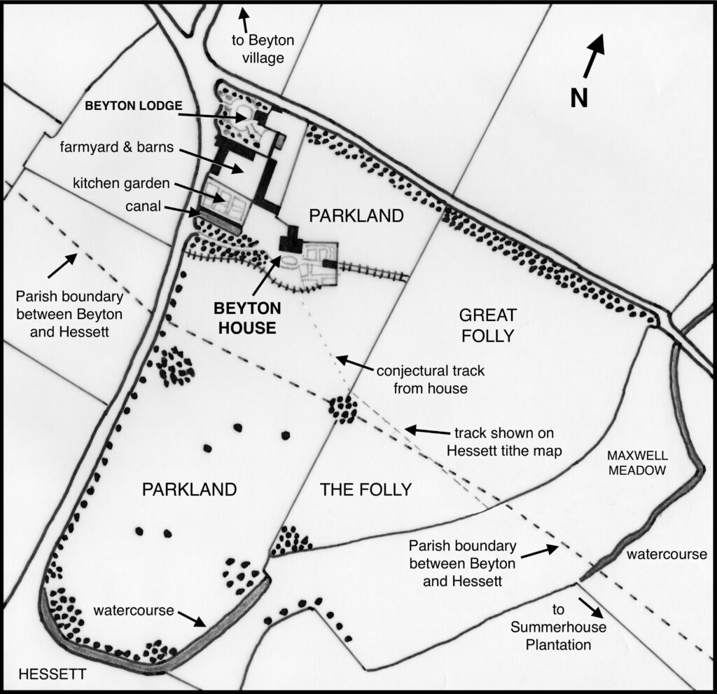 The building of the new house further east allowed the site of the old house to become a kitchen garden. Having lost its eastern arm, by 1838 the remaining arm of the moat had become a rectangular ornamental garden canal bordering the southern side of the partly-walled kitchen garden, probably reusing brick walls from the earlier house. With its entrance off the road between Beyton and Hessett, the drive from the west was lined with trees and ran parallel to the canal. This led to the south front of the house with an oval-shaped drive. A courtyard and stables were to the north. Formal gardens and paths on a geometric plan lay further to the east where flowers and possibly more vegetables were grown. A large building of unknown use, but possibly an ornamental summerhouse or orangery, lay within the formal gardens from where there was access to a fenced track running eastward that divided the north and south parks to a field named ‘Great Folly’ on the Beyton tithe map. The farmyard, barns and other buildings lay north and north-east of the partly-walled kitchen garden, and further north was Beyton Lodge and its gardens with circular drive surrounded by trees and shrubs to the front (west) and kitchen garden to the rear (east).