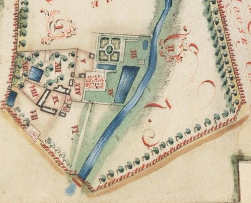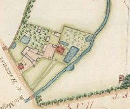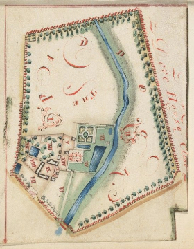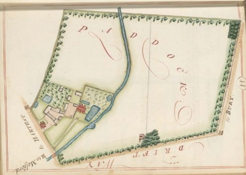Taken from the survey of John Plampin’s estate showing the site of ‘Paddocks’ mansion and gardens in 1776. Since 1756 the parkland had expanded taking in ‘Dove House Close’to the east of the brook. The buildings courtyard, orchard and ponds are little changed, but the square formal garden behind the mansion has gone and the area laid to lawn. NB: north is approximately at the top. (Yale Center for British Art, Paul Mellon Collection).