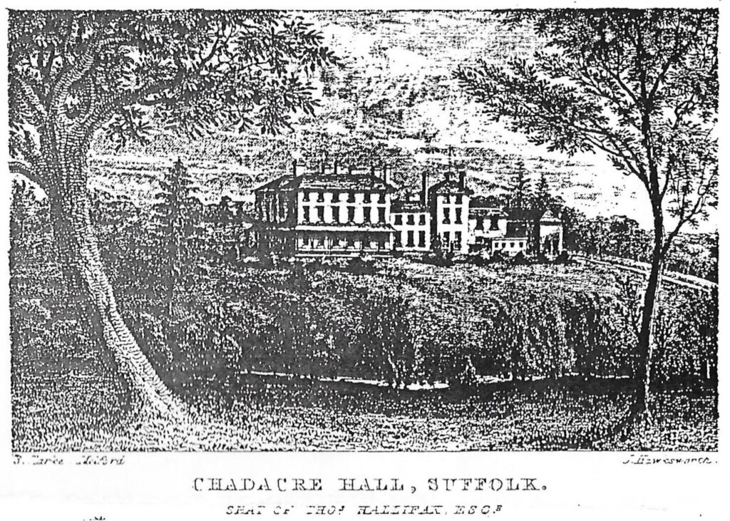An engraving of Chadacre Hall, the seat of Thomas Hallifax, undated but after 1834 when he bought the estate. The view is taken from the east with the Chad Brook is in the foreground and mansion on higher ground. Engraved by J. Hawesworth.