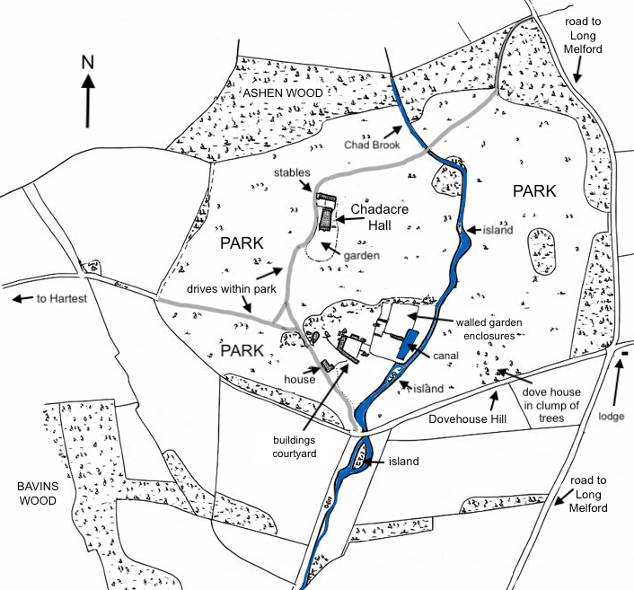 Standing isolated on high ground overlooking the Chad Brook as it flows south to join the River Stour at Long Melford, Chadacre Hall (Grade II) lies in a landscape park c. 13km (8ml) south of Bury St Edmunds within the parish of Shimpling. Chadacre was once a sub-manor of Shimpling – known as Shimplingthorpe during the nineteenth century – with its own manor house that was on another site near the present house. The parish consists of scattered hamlets and isolated farmhouses with Chadacre situated on its western boundary with Hartest parish, part of the landscape park is in that parish. The surrounding area is gently undulating farmland with chalky clay soil.