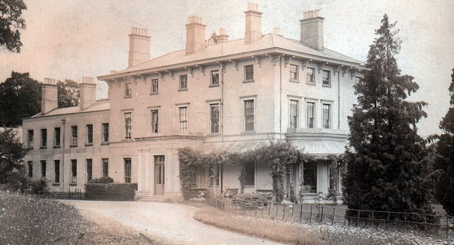 The west-facing entrance front of Chadacre Hall from a c. 1903 postcard. The stables/coach house are to the left beyond the lower service wing and the sloping parkland can just be seen to the right. (In a private collection).