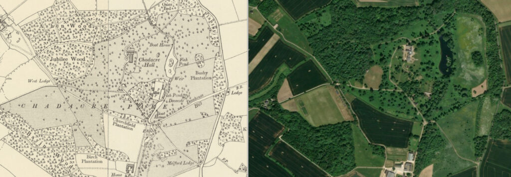 LEFT: The 1905 OS map showing Chadacre park (shaded). RIGHT: The same area today which shows some areas of the parkland to the south-west and south of the house have been converted to arable (darker green) although much of the parkland has changed little during the twentieth and early-twenty-first centuries. (OS map reproduced with the permission of the National Library of Scotland https://maps.nls.uk/index.html and Google aerial imagery © Bluesky, CNES / Airbus, Getmapping plc, Infoterra Lts & Bluesky, Maxar Technologies, Map data © 2025)
