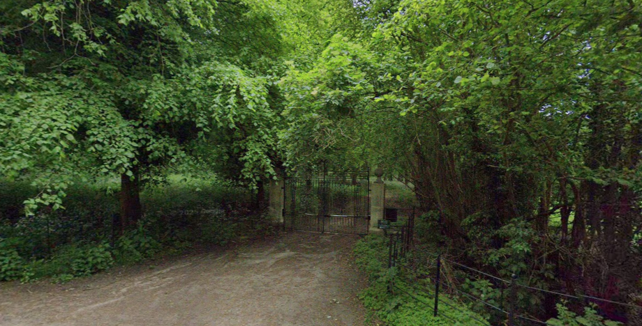 Now seldom used, the north-east entrance with stone pillars and metal gates. (© 2026 Google Street View)