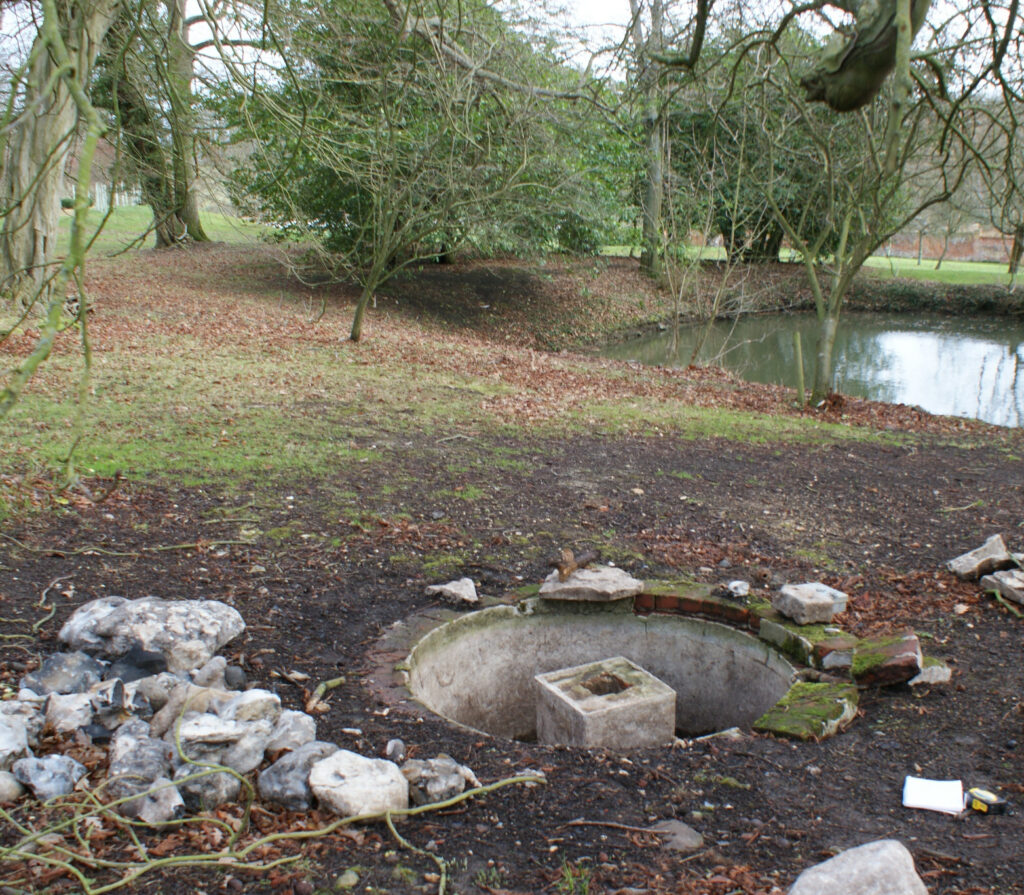 These works revealed the base of a freestanding-glasshouse, possibly for exotics, and the remains of a fountain that were once beside the paths from the house to the enclosures, probably dating from the mid- to late-nineteenth century. The pond originally in the orchard survives although the other canal-like ponds have been filled in. The largest has left the ghost of its edges in changes to the colour of grass in this area.