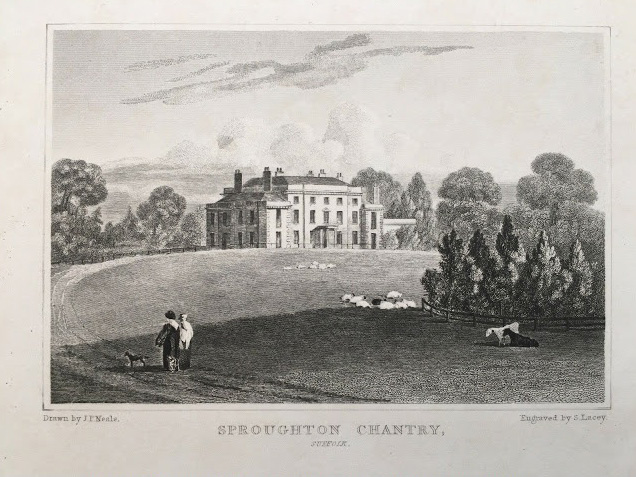 An engraving by T. Higham dated c. 1818 of the north elevation of the mansion shows a fence close to the house front and separating it from the surrounding parkland. However, over the next decade Charles Collinson removed the fence to open-up the front of the house to the parkland beyond and created a sweeping semi-circular in-and-out drive off the Hadleigh Road, shown in an engraving by John Preston Neale date c. 1829. In Jones and Co., Views of the Seats, Mansions, Castles, Etc. of Noblemen and Gentlemen in England, Wales, Scotland and Ireland the road was described as being concealed by a ‘sunk fence’ or ha-ha.