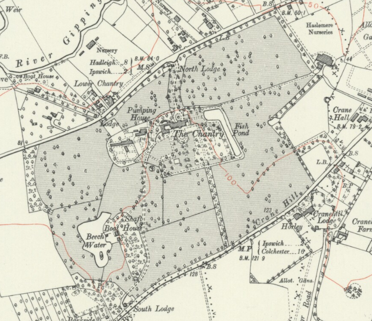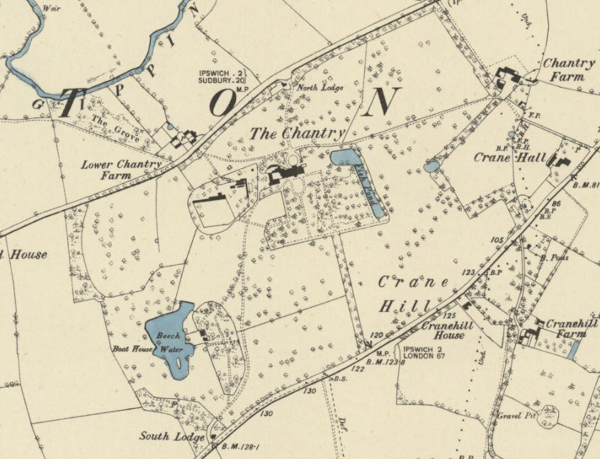 When owned by Metcalf Russell, Hodkinson’s 1783 map shows Chantry Park extending down to the River Gipping with the Ipswich to Hadleigh road running through the park to the north of the mansion. The park was bounded on the south by the present London Road, historically known as Crane Hill. The map also shows the main winding drive, now called Cricket Pavilion Drive, off Crane Hill from the south-west, passing a large irregularly-shaped lake in the lower part of the park, today known as Beech Water.
