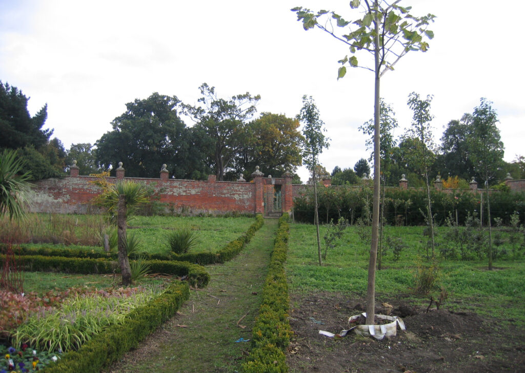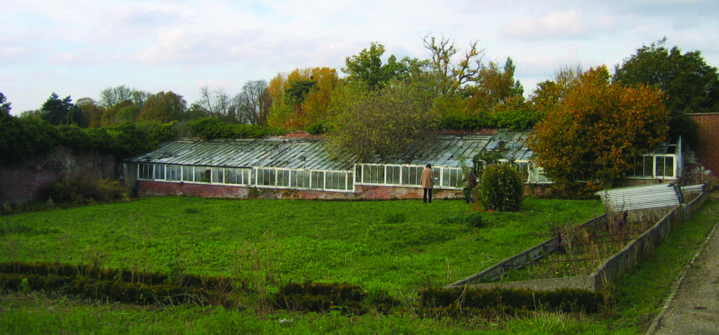 On sloping ground and lying c. 70m (230ft) west of the house is the walled garden complex, which sits in a lozenge-shaped area that includes the slip gardens outside of the walls. It consists of the main trapezoid-shaped walled garden covering an area of 80m (262ft) x 60m (197ft) with cut off south-east corner dating from the eighteenth century. Back sheds are attached to the outside of the north wall and a mid-nineteenth century gardener’s cottage with a mature espalier pear against its west wall. This large enclosure has a gothic-arched gateway along its southern wall giving access into the park and a bricked-up matching gateway on the western wall. At the time the mansion and park were given to the people of Ipswich in 1927 (see the 1927 OS map) it had perimeter and crosspaths, a freestanding glasshouse and stepped lean-to glasshouses against the south face of the north wall that survived in 2011 but have now gone. A large late-twentieth century glasshouse covers much of the internal space today.