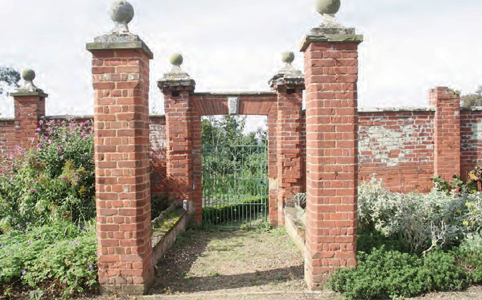 A smaller walled enclosure is attached to its east wall. Although shown on the tithe map as covering an area smaller than today, by 1886 it had been enlarged to the south so that its south wall joined the south-east corner of the larger enclosure to form a continuous southern wall along the edge of the adjoining parkland. Forming part of the major alterations and improvements made by Mrs Jump and Mr Notcutt, a newer section of wall was added that includes spaced piers topped by ball finials with an elaborate gated entrance with additional piers creating an open porch that has a date mark of 1908.