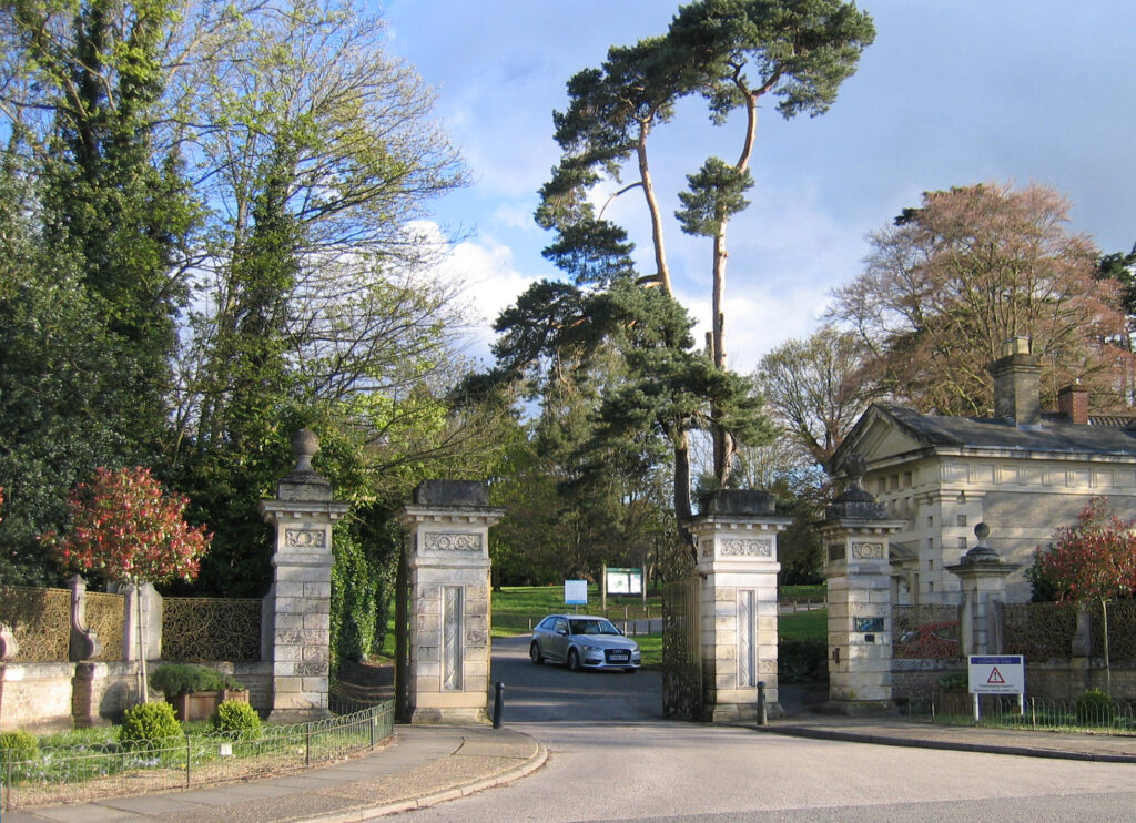 In addition to his Italianate remodelling of the house c. 1852, Sir Fitzroy Kelly altered the main approach to the house from the north by creating a single gently-curving drive starting about mid-point between the two earlier entrances. New entrance gate piers and gate house (Grade II) in the form of a classical temple were added. The main mid-nineteenth century wrought iron gates are set back from the road with a low curved brick wall topped with ornate wrought iron railings on either side. They were originally painted and gilded in blue and gold and known locally as the ‘Golden Gates’. Surviving specimen trees, possibly dating back to the eighteenth or early-nineteenth century, dot the lawns on either side of the north drive. The previous southernmost entrance along the Hadleigh Road was now only used for access to yards and the rear of the walled gardens, as it is today.