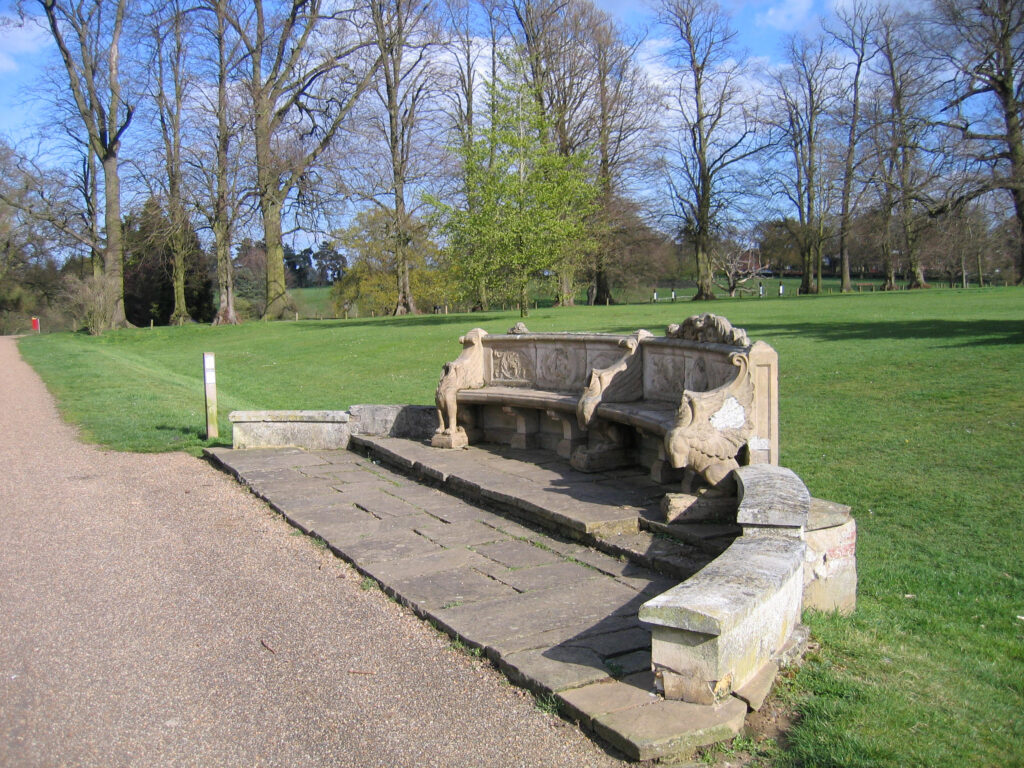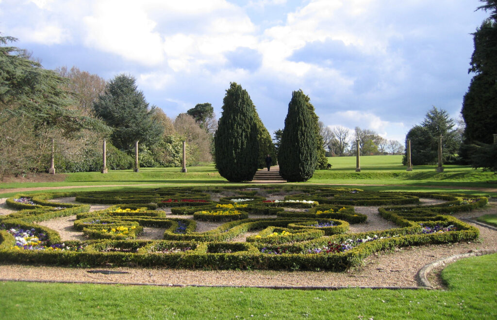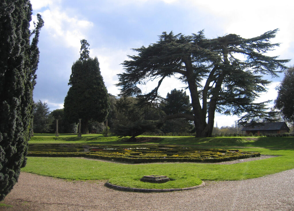 Little is known about the layout of the early pleasure gardens of The Chantry, although in 1829 they were described as having ‘rare and exotic plants’ with spacious lawns sloping down to the River Gipping. Sales particulars for the Chantry Estate dated 1867 suggest William Andrews Nesfield (1793–1881), the renowned landscape designer, had been employed by Sir Fitzroy Kelly to design the formal parterre and knot garden to the south of the mansion. This used intricate patterns of box tracery on gravel beds, decorated by urns and surrounded by a semi-circular grass terrace. A series of surviving columns, once topped with vases and linked together with chains, stand on this terrace. The main axis of this garden extends along a raised walk to a stone seat beside a grass bank that separates the pleasure gardens from the parkland to the south. As this bank does not appear on maps until 1887, it is probably not the work of Nesfield.