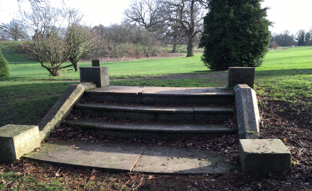 On the east front, lawns slope down to an ornamental L-shaped pond. A straight path, once leading from the now demolished conservatory, runs down to a small landing stage ornamented by surviving stone steps that once had balustrading, now gone. This pond is shown on the tithe map of 1837, but due to its shape, may be much older and possibly associated with Edmund Daundy’s chantry. It is now surrounded by mixed shrubberies, including many rhododendrons planted in the early-twentieth century by Mr Notcutt. The pond has a walkway along its eastern side, beyond which the ground slopes sharply down, suggestive of a made-made feature. A further walkway leading alongside the lawn to the east of the parterre is on its western side.