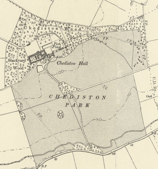 A house is known to have occupied the site since at least the sixteenth century. The Pettus family owned the estate during the seventeenth century, later passing to the Fleetwoods. With Tudor origins, in 1735 the house was said to have been rebuilt in ‘a beautiful Manner’ by Walter Plumer who ‘made it his seat’, although a lease dated 1801 shows that Chediston Hall was a tenanted farm. G. W. Parkyns purchased the estate in 1833 and largely rebuilt the house in a neo-Jacobean style. On his death, and after some legal technicalities regarding his right to own property, it eventually passed to his sister M. C. Leguen de Lacroix but appears to have been tenanted as a farmhouse over the following years, although Eugene Jean Leguen de Lacroix lived there at his death in 1936. Requisitioned during World War II, it suffered fire damage and remained unoccupied until its demolition in 1955, after which the farming estate was sold to James Aldous (1933–2010) who built a new farmhouse on the site, which continues to be owned by the family in 2025.