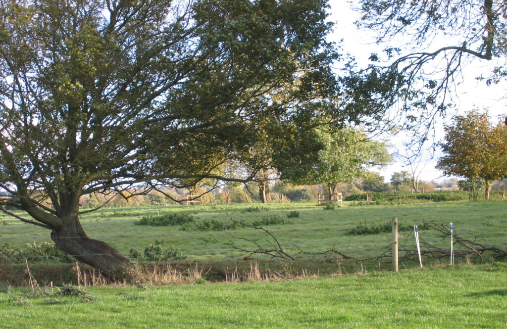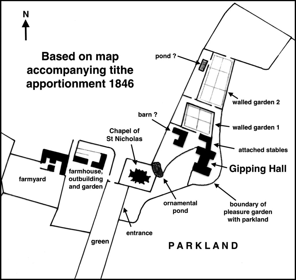 Davy’s 1824 engraving of Gipping Hall shows a wrought iron fence close to the large H-shaped house separating it from parkland where sheep graze. A newly-planted hedge and young trees are depicted along the eastern boundary between the gardens and park that would have obscured views over parkland in that direction but helped to deal with the cold east winds buffeting Gipping Hall. The top of a clock tower on a stable building and mature ornamental trees are shown behind the house. By the time of the map accompanying the 1846 tithe apportionment there was a large building, possibly a barn of a much earlier date, north-west of the mansion and an L-shaped ornamental pond over which there would have been views to the chapel. It has been suggested that Gipping Hall was a base for hunting, which may explain why there is so little area given over to a formal garden. The site also included two walled enclosures to the north that are shown with perimeter and cross paths typical of kitchen gardens. The garden nearest the house was a parallelogram shape, which would have given more area of sheltered walling than the rectangular-shaped further garden. Once the house was demolished the walls of these gardens slowly deteriorated and scattered trees took over the site, although some walls appear to have survived into the 1900s. This area is now agricultural grazing land with only humps, bumps and clumps of nettles, shrubs and trees acting as the ghost of their former existence.