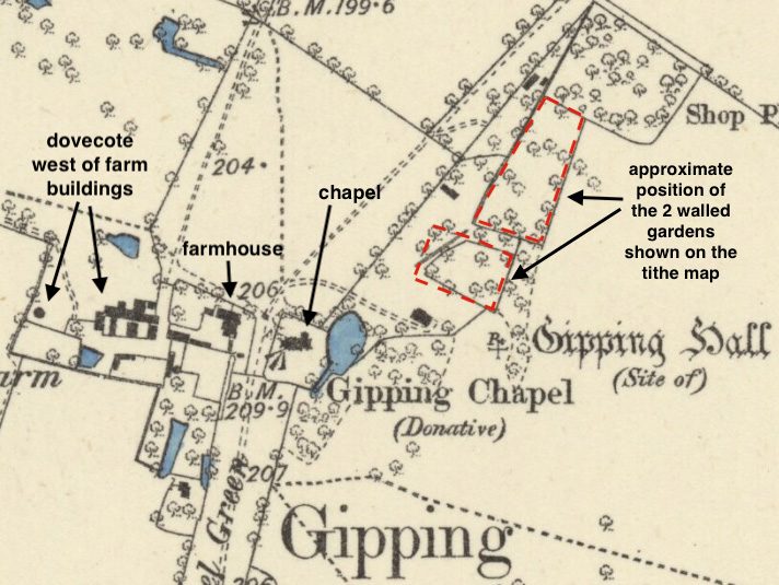 Although eighteenth century maps mark the house and chapel but not an attached park, in its heyday during the fifteenth to seventeenth centuries and given its high-status, Gipping Hall mansion is likely to have been set in a much larger park than shown on the 1846 tithe map when the house was tenanted. For many centuries the green would have acted as a wide formal entrance drive culminating in a view of the elaborate chapel at its northern end. Although the public highway now stops at this point, a track with public access continues northward towards Cotton. Opposite the chapel is Chapel Farm, the once home farm for Gipping Hall and hidden from view by modern farm buildings further west lies an early-eighteenth century octagonal dovecote (Grade II).
