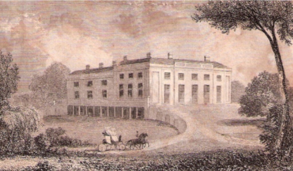 After retiring from active service abroad on health grounds in 1804, Lieutenant-Colonel Thomas Pogson returned to England and in 1806 met and married Emily Myers, cousin to George Thomas. Six years later Thomas Pogson bought George Thomas’s house and land. Norman Scarfe, editor and translator of de La Rochefoucauld’s book suggests the farm may be the later-named ‘Pogson’s’. Soon after Thomas demolished the house and built a new mansion. An undated engraving shows the new mansion perched on the top of a gentle rise with an undercroft cut into a slope. A horse-drawn carriage is shown travelling along a curving drive with another drive forking off this.