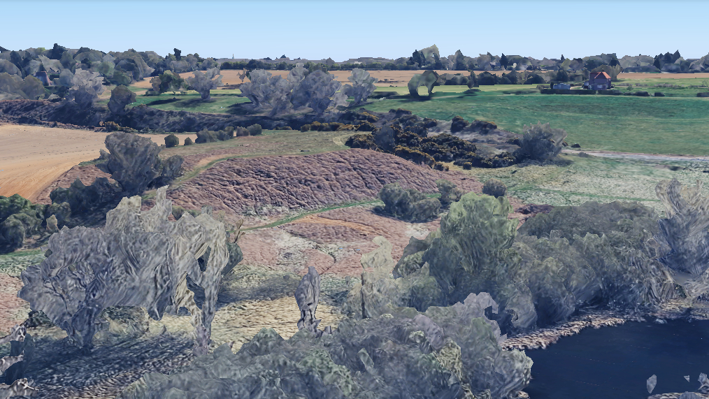 A view of the escarpment in 2025 representing the site of the undercroft of the house which would have been at the top of the rise and overlooking Playford Mere (bottom right) and its floodplain. The site of Pogson’s Farm was on the other side of the railway line just off the image top right. (© 2025 Google Earth)