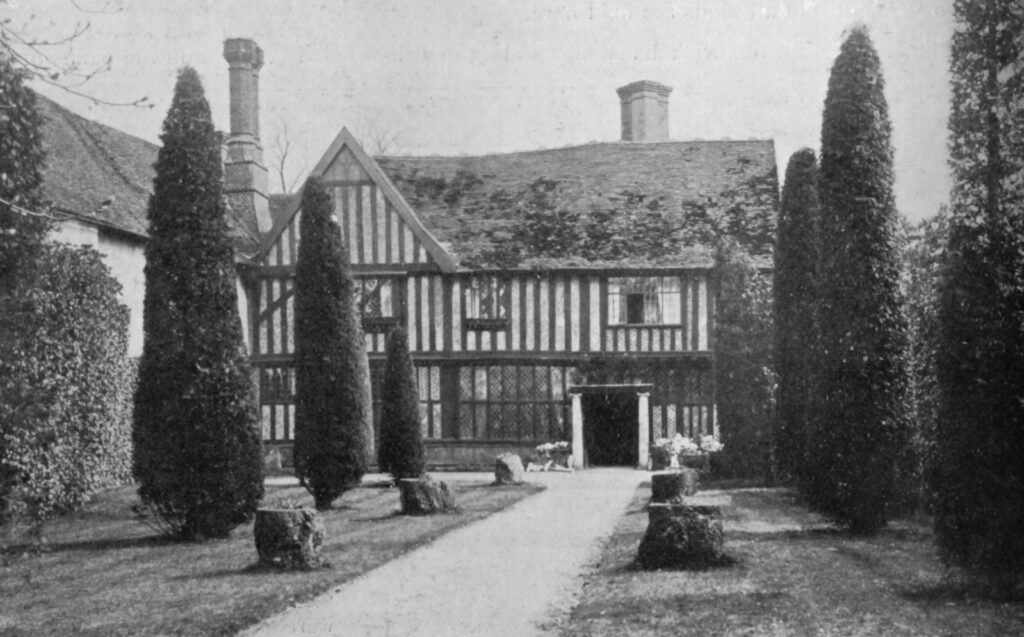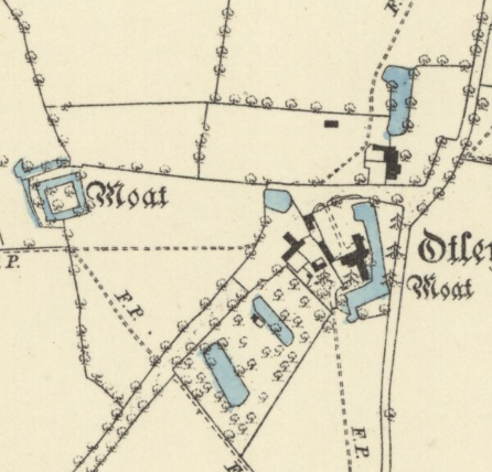 It is believed the original main entrance was off a surviving track to the north of the house via a bridge with gatehouse over the moat before entering into a courtyard between the wingsod the house. This wide track is shown on the 1884 OS map as tree-lined and running south towards the village. The western service ranges of the Hall were demolished leaving the present timber-framed house with a south entrance court and some exceptional sixteenth and seventeenth century wood panelling and moulded beams. Only the eastern arm and short returns westward of the moat remain. About 200m (656ft) to the west is a small, square, overgrown moated site that is thought to have been associated with the Hall, possibly surrounding a small building that may have been used as a remote ornamental garden feature and family retreat.