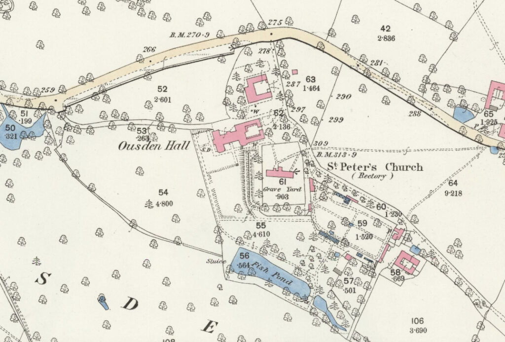 Close to the county boundary with Cambridgeshire c. 11km (7mls) south-east of Newmarket and 13km (8mls) south-west of Bury St Edmunds, Ousden lies in an area of undulating, free-draining chalky bounder clay and is believed to be the highest village in East Anglia. The former site of Ousden Hall, which was demolished in 1955, lies beside the twelfth century Church of St Peter (Grade I) and remote from Ousden village, which lies to the east. The site is south-sloping and overlooks a tributary of the River Kennett. The gardens of the former Hall, including a canal that developed from the remaining arm of a former moat and raised walkway, are now part of the gardens of Ousden House, which is a remodelling and extension of the original late-eighteenth century stable block (Grade II). The site also contains a mid-nineteenth century clock tower (Grade II) and eighteenth century dovecote (Grade II), both associated with Ousden Hall. It is surrounded by a designed parkland landscape that originally developed from wood pasture and ancient woodland.