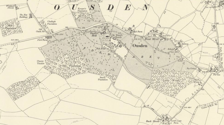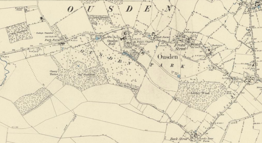 In 1864 the Ousden Hall Estate extended to 943ha (2,330a) and an advertisement in the Solicitors Journal at the time of its sale describes the park studded with ‘noble oaks and other trees of large growth’… ‘The park, woodlands, and plantations afford excellent cover for game’.