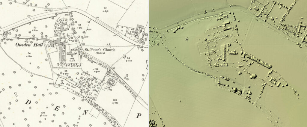 A copy of an eighteenth century estate map shows a U-shaped house with a U-shaped moat to its south. This moat had its east arm alongside the churchyard with a causeway at the south end giving access to a small enclosure called ‘Garden Pightle’ with two fishponds on its south side. Another estate map from the late 1830s shows an H-shaped house with the moat filled-in except for one arm, shown as a narrow canal next to the churchyard with a substantial flat-topped embankment on its west side. Today this embankment with a walkway lie in the grounds of Ousden House and have a line of yew trees along its western margin that are shown on a map dated 1885. Terraced walks of this kind were very fashionable during the seventeenth and eighteenth centuries suggesting it may be from that period, possibly at the time of rebuilding the Hall by the Moseleys in the mid-eighteenth century.