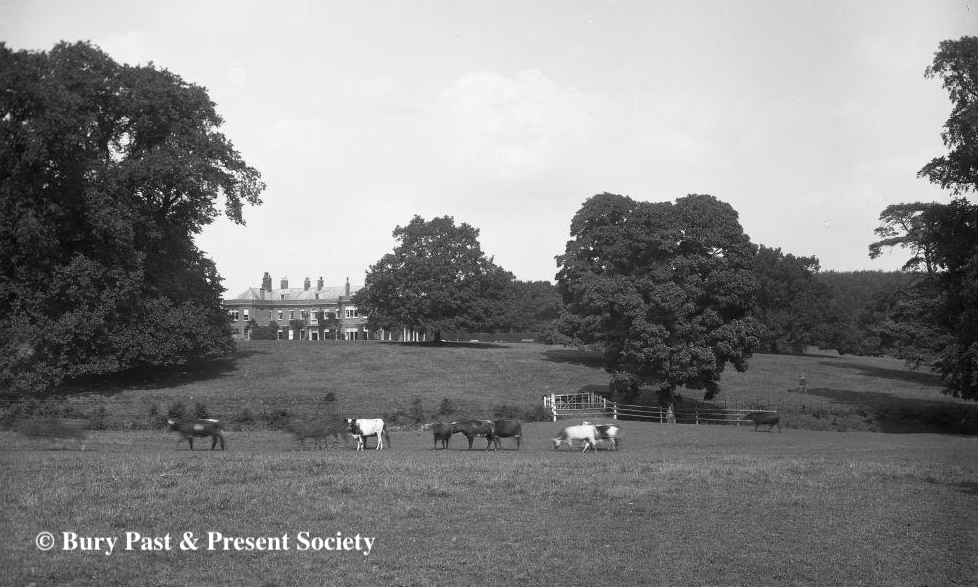 Surrounded by a moat, Ousden Hall was erected in the time of Queen Elizabeth I for the Moseley family who rebuilt it in the mid-eighteenth century to create a large U-shaped building with projecting wings at the rear, possibly leaving just the porch from the earlier house standing. The house was enlarged and remodelled c. 1820 and described in 1827 as being on ‘rising ground, and commands several pleasing views over the vicinity and adjoining county of Cambridgeshire.’ In 1835/6 Thomas Ireland engaged the architect Thomas Rickman to make further alterations in the ‘Grecian style’ to give a house with a north-facing entrance front, west elevation looking over the parkland and south-facing garden front, described in White’s 1855 Directory of Suffolk as ‘a handsome mansion, with pleasant grounds’. It was reported that Thomas Ireland entertained King William IV when he attended the races at Newmarket.