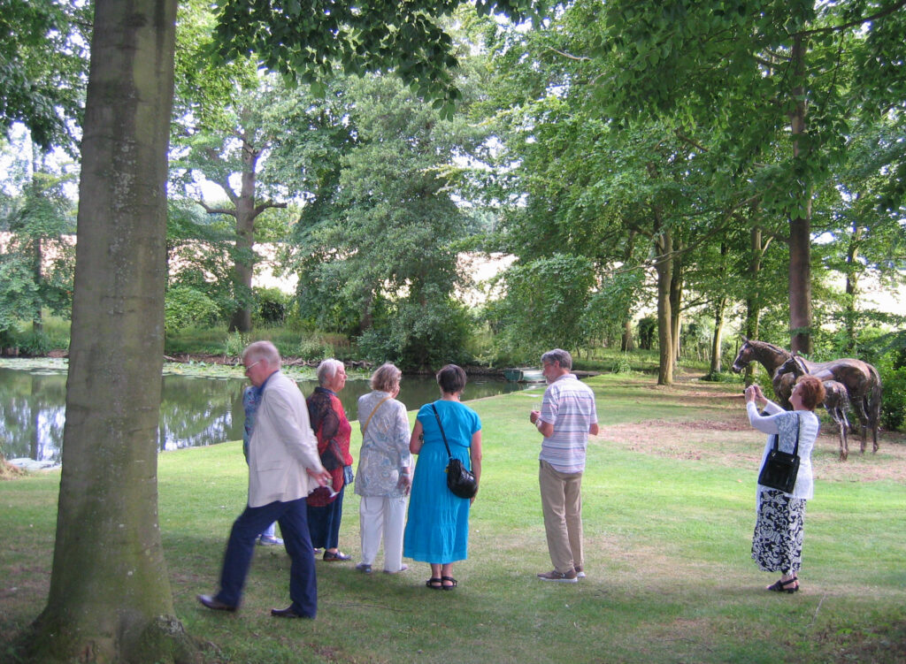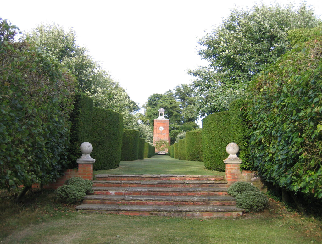 From the 1970s Alasdair and Lavinia Robinson developed the gardens around Ousden House and, having bought some of the surrounding land that was once part of the parkland to Ousden Hall, have created a series of garden rooms that include a crinkle-crankle yew alley with the clock tower as its focal point, herbaceous borders designed by Arabella Lennox Boyd, a moat garden, woodland and ornamental lake. The courtyard created by the stable buildings, now Ousden House, has been used to develop a sheltered formal garden from where there is a view of the dovecote.